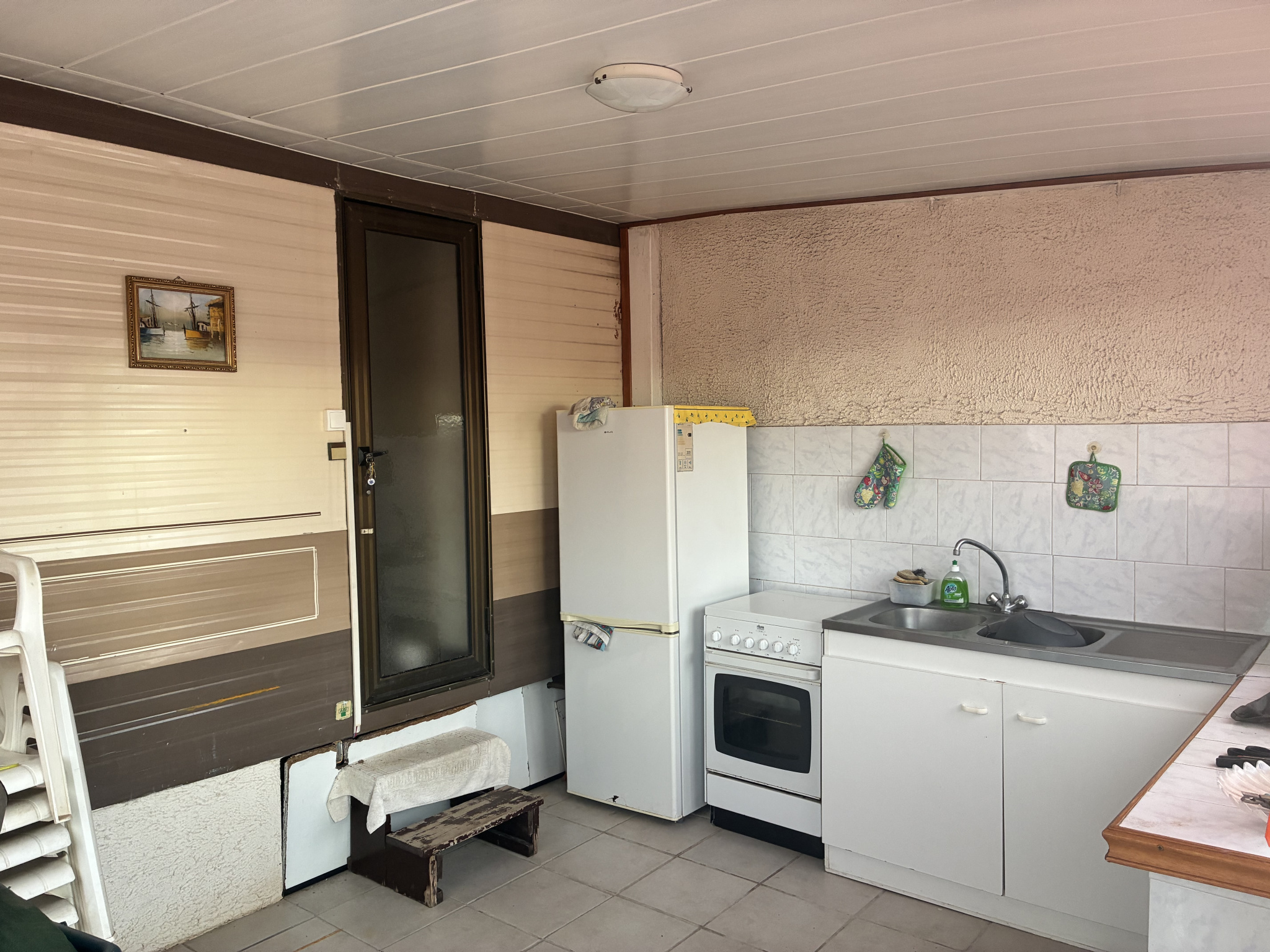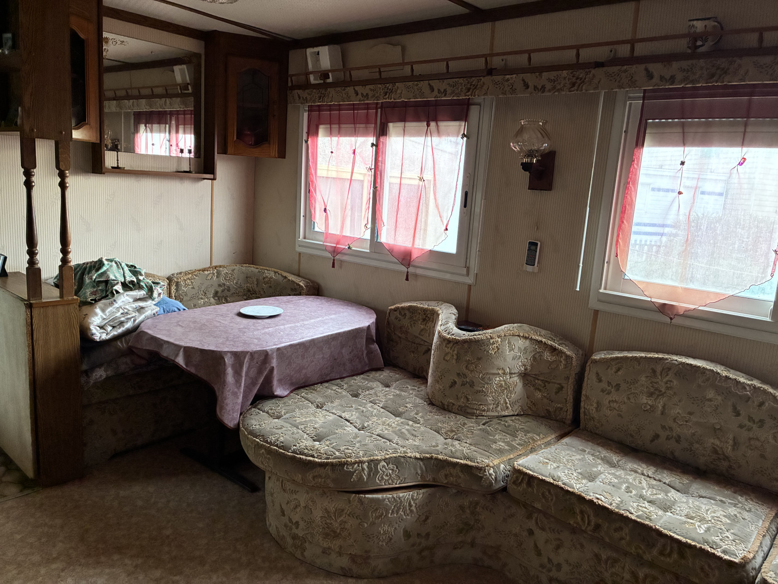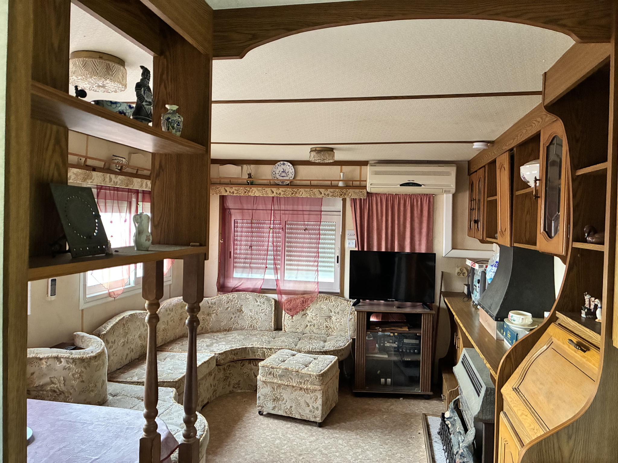 Il se compose d'une cuisine en dur avec coin repas, 2 chambres, un salon avec banquettes, une salle d'eau avec wc, clim réversible.